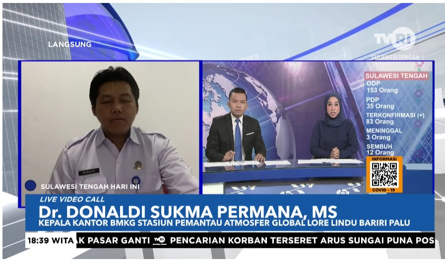 Palu, 10 Mei 2020 pukul 18.30 WITA Kepala Stasiun Pemantau Atmosfer Global Lore Lindu Bariri Dr. Donaldi Sukma Permana, MS berkesempatan menjadi narasumber di TVRI Sulteng untuk membahas tentang prakiraan awal dan puncak musim kemarau serta antisipasi menghadapi puncak musim kemarau kemarau tahun 2020 di wilayah Sulawesi Tengah. Secara umum, zona musim di Sulawesi Tengah diperkirakan akan memasuki awal musim kemarau pada bulan Juni - Agustus 2020. Sedangkan puncak musim kemarau 2020 diperkirakan akan terjadi pada bulan September 2020. Sifat musim kemarau 2020 akan berada pada kondisi diatas normal. Untuk lengkapnya, dapat diakses pada link berikut https://www.tvrisulteng.com/2020/05/prakiraan-awal-musim-kemarau-dan-puncak.html.