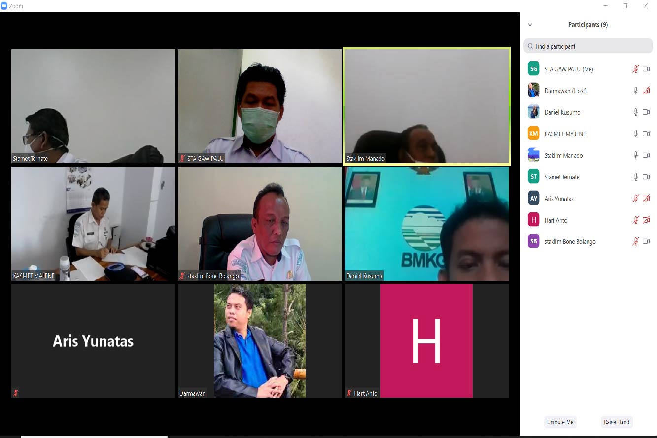 Palu - Selasa (21/4) telah dilaksanakan video conference (meeting online) terkait kegiatan pemeliharaan peralatan otomatis klimatologi yang dipimpin oleh Kepala Balai Besar MKG Wilayah 4 dan diikuti oleh seluruh koordinator data di wilayah Sulawesi dan Maluku. Kepala Balai 4 menyampaikan arahan dari Kepala BMKG agar pemeliharaan peralatan otomatis tetap dilanjutkan pada masa COVID-19 karena hal tersebut menunjang informasi apabila terjadi bencana hidrometeorologi. Akan tetapi, dalam pelaksanaannya tetap perlu mengacu pada peraturan yang berlaku untuk pencegahan dan penyebaran COVID-19.