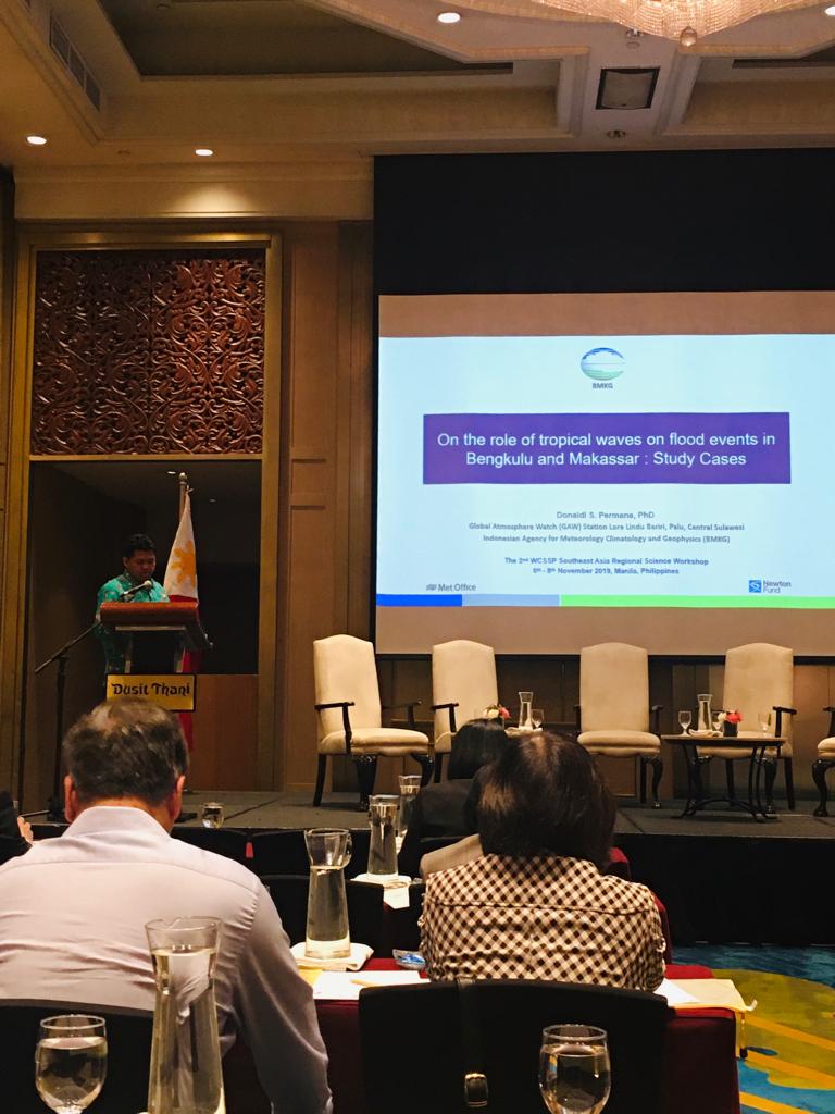Pada tanggal 6 - 8 November 2019, Kepala Stasiun Pemantau Atmosfer Global Klas I Lore Lindu Bariri - Palu, Dr. Donaldi Permana ikut hadir sebagai salah satu delegasi Indonesia pada kegiatan the 2nd Regional Science Workshop - Weather and Climate for Service Partnership (WCSSP) Southeast Asia di Manila, Filipina yang diselenggarakan oleh Met Office, UK dan DoST-PAGASA, Filipina. Dr. Donaldi menjadi presenter dengan topik peran gelombang tropis (tropical waves) dalam kejadian banjir di Sumatera dan Sulawesi. Workshop ini dihadiri oleh negara ASEAN diantaranya Indonesia, Malaysia, Filipina, Vietnam dan Thailand. Delegasi Indonesia dipimpin oleh Dr. Urip Haryoko, Kepala Pusat Meteorologi Maritim BMKG dan beranggotakan tim dari BMKG, STMKG, LAPAN dan ITB. Dalam workshop ini, BMKG berupaya untuk dapat mengembangkan Ina-NWP (Indonesia Numerical Weather Prediction) secara mandiri.